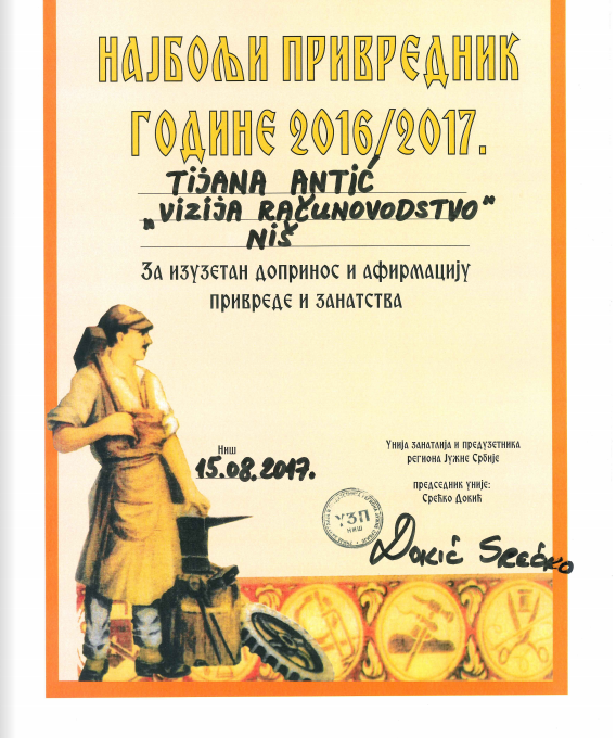Vizija Računovodstvo je ispunjavanjem strogih kriterija u protekloj godini, u društvu jake konkurencije, dobila certifikat za najboljeg privrednika godine 2016/2017 za jug Srbije koji dodjeljuje Unija zanatlija i poduzetnika regije Južna Srbije.